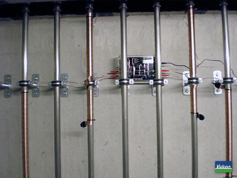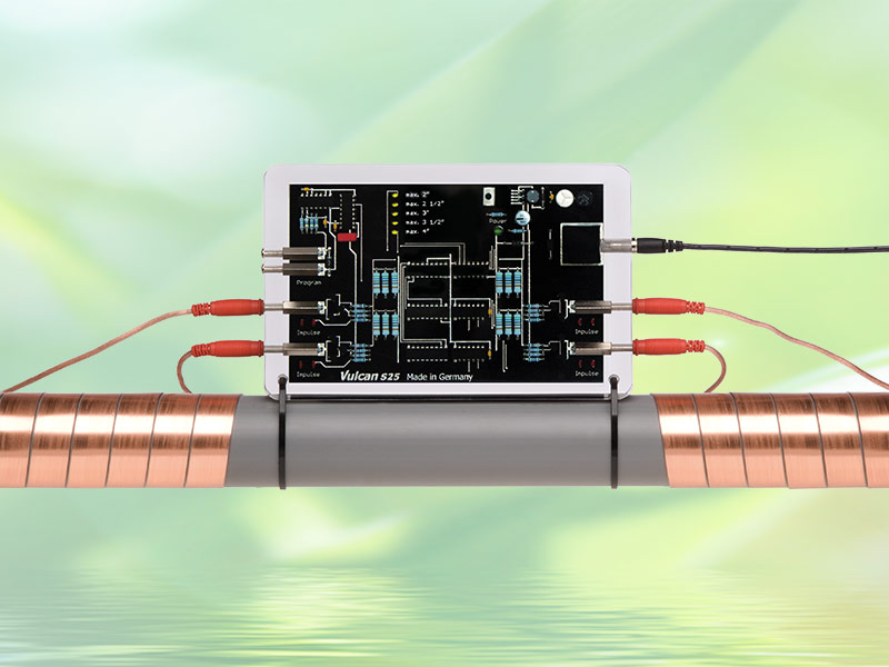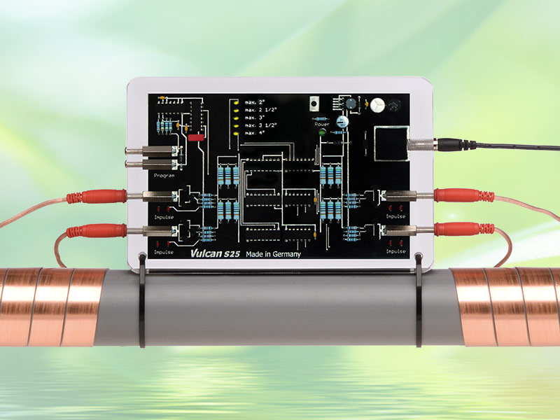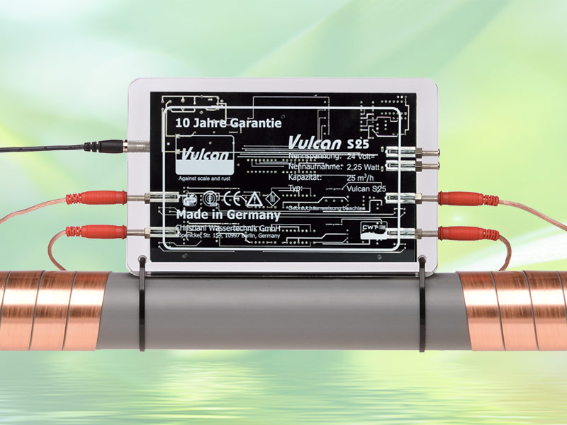 Vulcan is an eco-friendly water treatment system that protects your piping system and appliances against scale deposits and rust. The Vulcan-Impulse-Technology is based on the principle of physical water treatment. Special electronic impulses change the crystallization process of the liquid calcium. This way the hard scale loses its adhesive power. The technology works exclusively with capacitive electric impulses:
